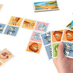 Hoy es un día perfecto para un alegre desfile de animales. Los niños/as colocan las cartas de forma que los animales emparejados queden uno al lado del otro. ¿En este momento es imposible colocar ninguna carta? Pues algunos animales van a parar al cenagal... Gana quien al final de este safari de dominó tenga que sacar menos animales del lodo.