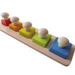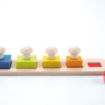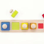 5 piezas en forma de cuadrado y con pivote grande para una mejor manipulación. Ayuda a los niños a entender la secuéncia y a asociar según la forma geométrica, el tamaño y el color. La base incluye el color correspondiente.