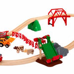 El set ferroviario de granja con ganado 33984, con 30 componentes, te llevará de vuelta a la naturaleza con su entorno rural. La locomotora de mercancías a pilas está en marcha y lista para recoger la comida y llevársela a los adorables animales. Usa la estación de carga de heno para levantarlo y dejarlo caer al vagón de mercancías. Después, atraviesa las colinas hasta llegar a la granja, donde el tractor te espera para entregar la comida a los animales que pastan en los campos.