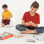 20 fichas de madera + 2 fichas doble cara + hojas de pegatinas + tapete de juego + instrucciones.
