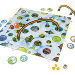 Con un poco de sentido de la proporción y un poco de suerte con los dados, los niños/as pueden conseguir cristales brillantes que le esperan al final del arco iris. Debéis reunir suficientes cristales azules para cambiarlos por otros dorados. Pero, ¿qué arco iris es el más indicado para conseguir el mayor tesoro? Quien primero consiga hacerse con tres cristales dorados ganará esta competición de reunir colores brillantes.
