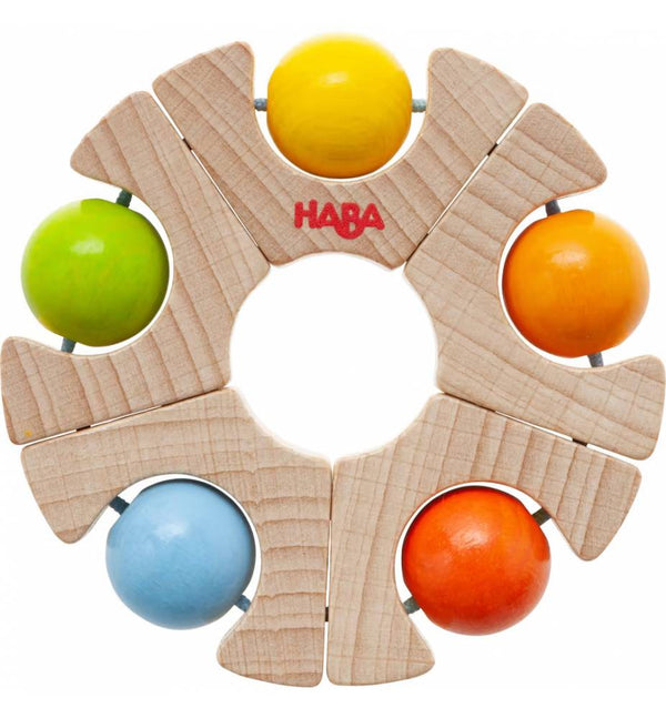 Primero algo para los ojos, luego para las manos: este sonajero entusiasma a los/as bebés con sus alegres colores y sus bolas que traquetean con un sonido divertido.
