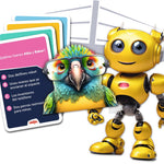 CONTENIDO: 222 cartas con preguntas y respuestas de 4 categorías, 8 cartas de respuestas (4 de naturaleza y 4 de tecnología), 1 cuadrilátero (base de la caja del juego con una cuadrícula compuesta por 3 piezas y 1 tablero) y 2 mascotas, 4 fichas redondas de colores, 2 pinzas de la ropa, 1 instrucciones del juego