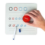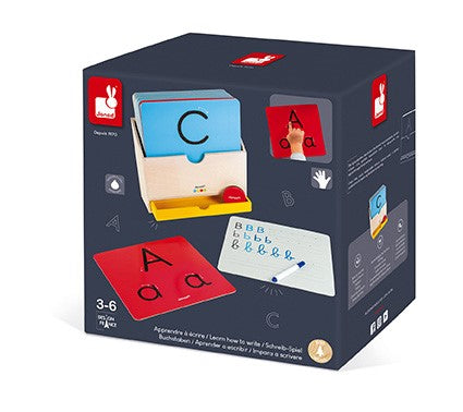 Una tarjeta de cartón con anverso/reverso para cada letra. En el anverso se encuentra la letra en relieve con flechas para indicar el sentido de escritura y estimular el sentido del tacto; y el reverso es una cara borrable para practicar la escritura de la letra siguiendo el modelo.