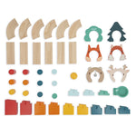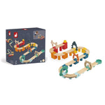 | Se colocan los pilares en su lugar, luego se montan los raíles, cuidado con las curvas… ¡Y, por último, las puertas! ¡Y listo! ¡Allá vamos, ahora lanza la bola! Primer giro, línea recta, segundo giro, suena la campanilla, ¡has ganado! Este magnífico circuito de bola está compuesto por 44 piezas de madera: 13 conectores, 12 pilares, 12 raíles, 6 puertas y una bola. Con o sin modelo, su hijo construirá una y otra vez los circuitos más bonitos. Ideal para desarrollar su motricidad fina, imaginar, inventar y crear. Juguete de madera FSC y pintura al agua. Para niños a partir de 2 años. |