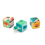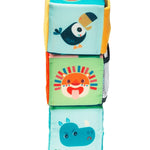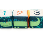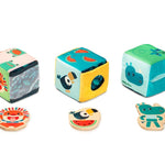 Este juego de selva evolutivo consta de 3 cubos de tela y 3 personajes de madera. Cada lado ofrece un nuevo desafío: montar el cocodrilo, aprender a contar o reconocer los números del 1 al 3. Puedes asociar los 3 personajes de madera en un lado y cada uno tiene un escondite. ¡Original y desafiante para las manos y el cerebro!
