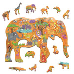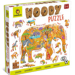 Un puzle de madera de forma especial en el que está representado un colorido paisaje. Entre las piezas que componen el puzle hay 12 animales perfilados que también se pueden colocar de pie sobre sus bases. El juego estimula la lógica, las habilidades visoespaciales y la motricidad fina.