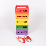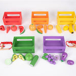 tickit® Cajas de madera para clasificar frutas y verduras es un hermoso conjunto de 5 cajas de madera apilables llenas de frutas y verduras de madera. Son de colores brillantes para combinar con su caja codificada por colores con detalles pintados a mano. Cada caja contiene dos piezas de fruta y dos verduras, todas con agujeros para enhebrar, y el aguacate viene en dos mitades, ambas enhebrables. Hay dos cuerdas con enhebradores y topes de madera para que su hijo pueda crear deliciosos kebabs de frutas y verduras.